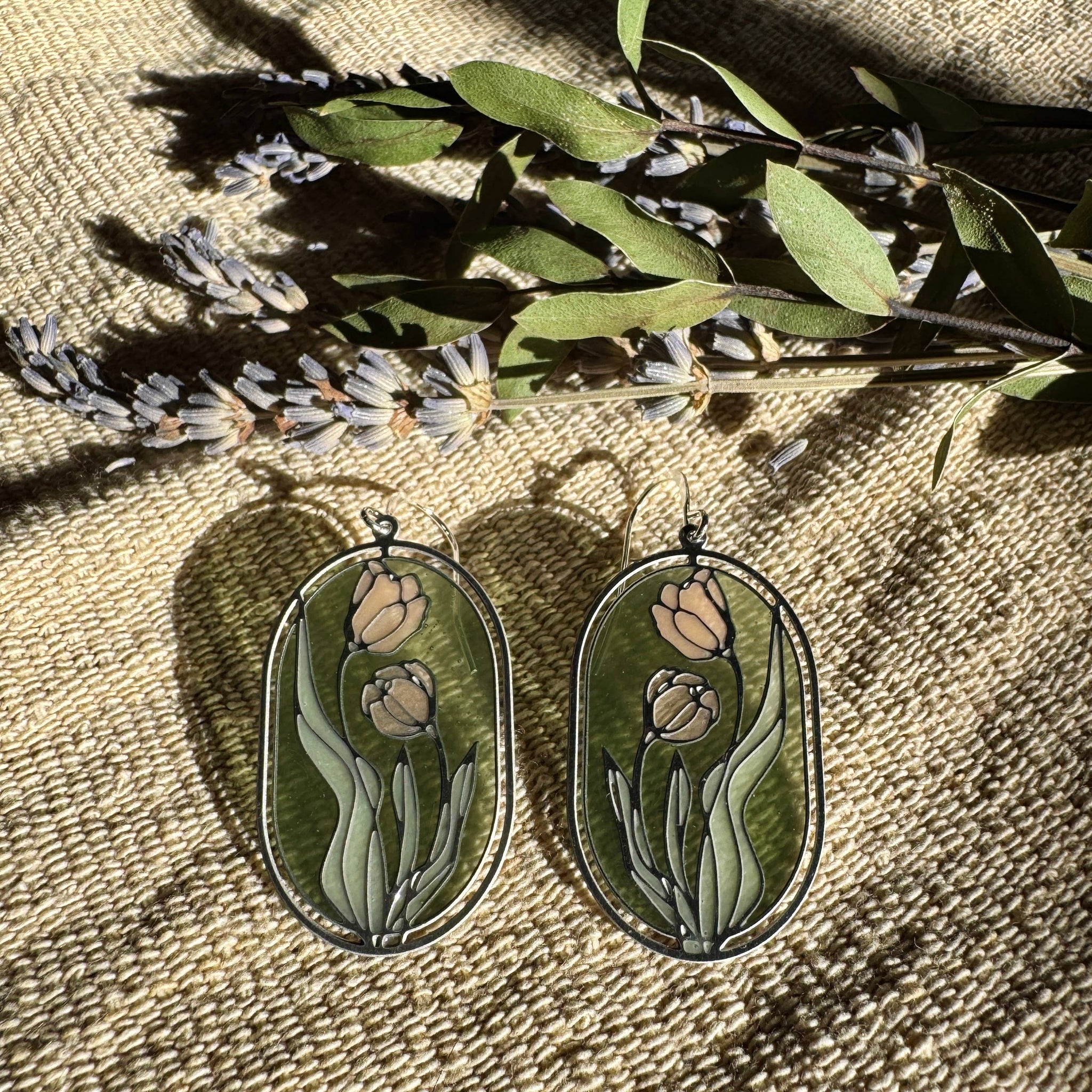 This modern design features a stainless steel botanical design with soft-colored resin stained glass that catches the light beautifully. Handmade with high-quality components and solid metal findings, these delicate yet durable earrings are lightweight and comfortable to wear. They measure 1x2", making them the perfect size for everyday wear.