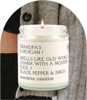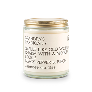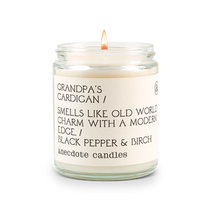 A new take on an old classic, Grandpa’s Cardigan is a scent of contrasts. Smoky birch notes are layered with spicy scents of black pepper and cardamom. Hints of mandarin and jasmine add a soft finish to the smoke and spice.