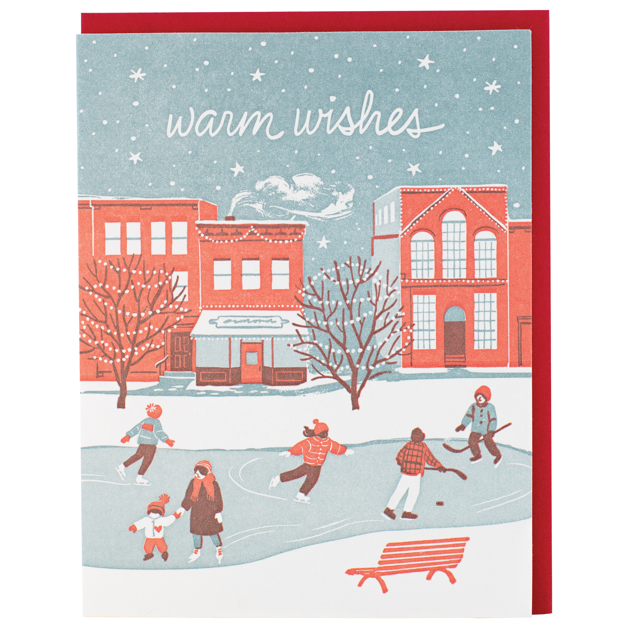 Families and friends skate enthusiastically on a city rink. Lighted trees, townhouses, and storefronts look sweet and wintery in the background. The hand-lettered text is nestled in the stars.