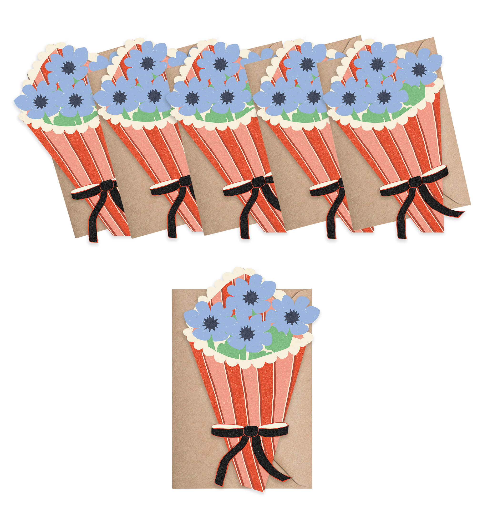 The Flower Bouquet as mini card, a perfect little gift! A set of 6 sweet little cards to use as quick notes, or gift labels. Each box has 6 mini folded cards and matching kraft envelopes. 3.5"x2.5" folded card, printed in the USA on sustainably produced #120 coated card stock.