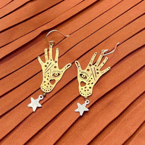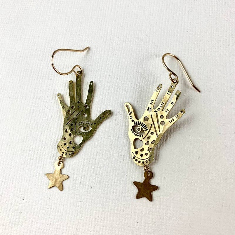 Hand pendants hang above a star charm from 14 karat gold filled or silver ear wire. Available in gold, silver or mixed metal.