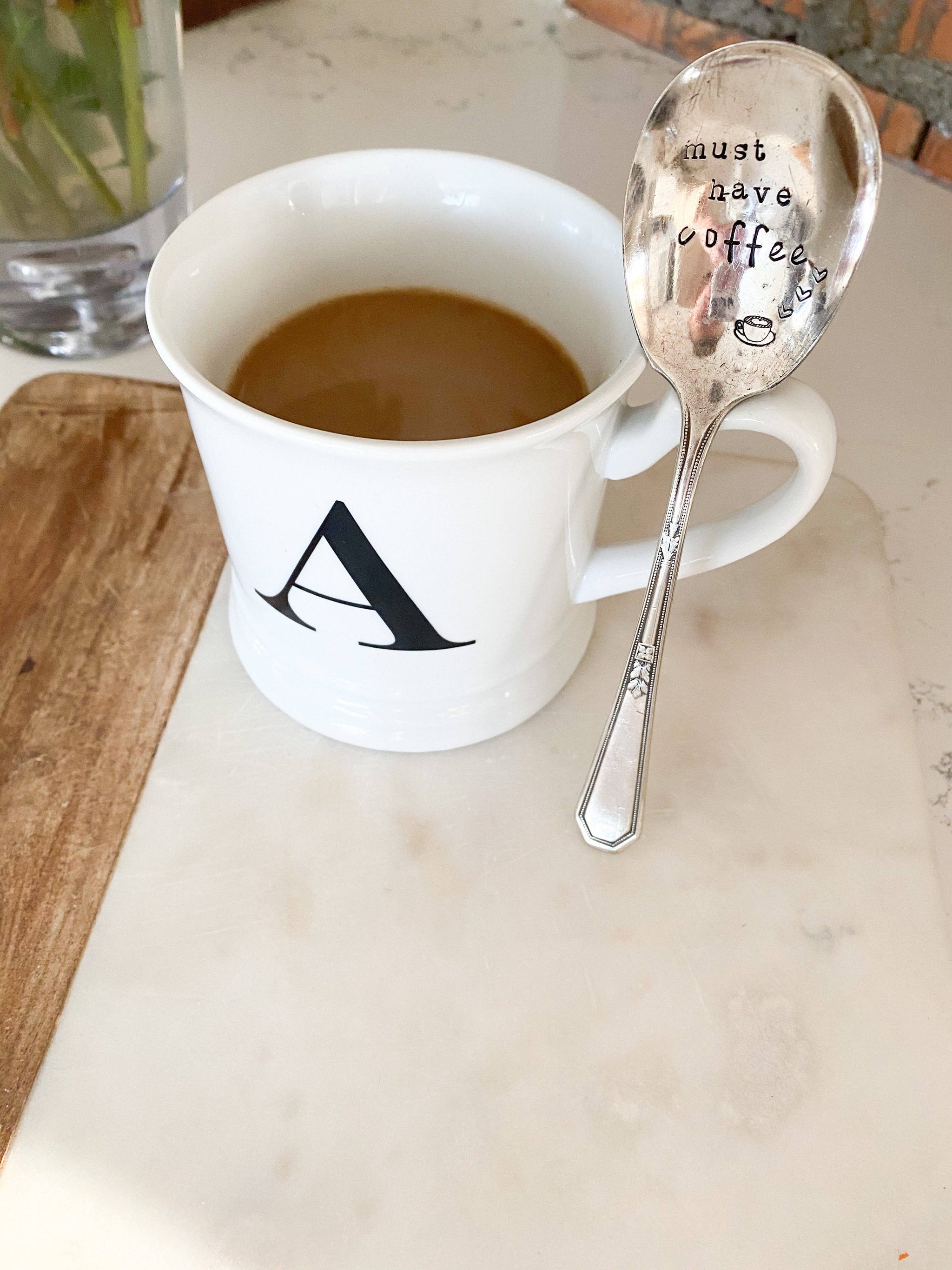 Hand stamped “Must Have Coffee” with a mug and hearts. This is for ONE spoon. These are vintage spoons so there will be imperfections! They may not resemble the same spoons in the picture either as those are examples. They are hammered and stamped with the wording. Spoons will vary in size. color and metal (meaning patina or tarnish). Each spoon will be different which adds to the uniqueness of this set.